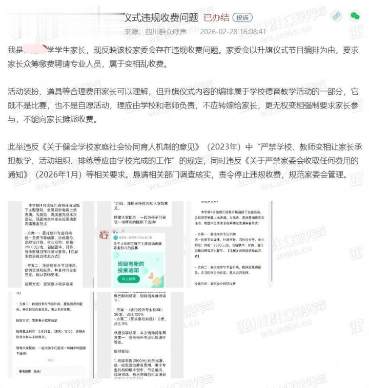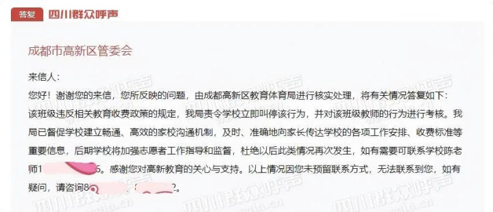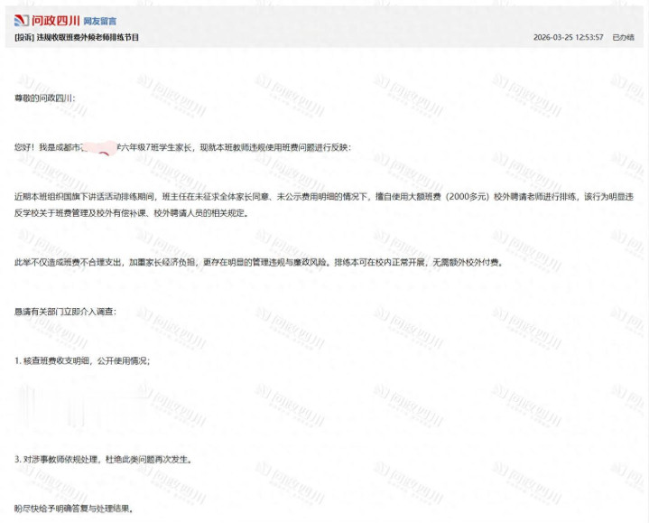 近日,有四川成齐的家长在问政平台上留言,投诉班主任违法收取班费外聘老诚排演节目。