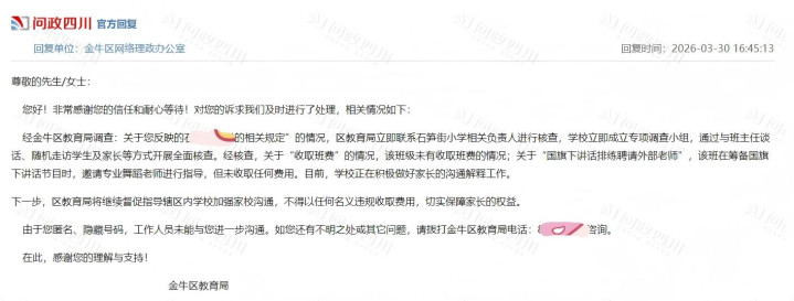 黄金城官方网站入口 成齐家长投诉班主任擅用班费请问授排演升旗典礼, 训诫局: 未收费