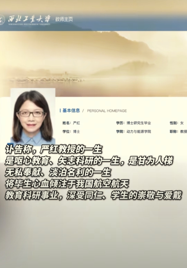 这件事情的启事是西北工业大学能源与能源学院发布讣告称,我国航空发动机领域着名内行一样亦然西北工业大学能源与能源学院西宾博士生导师严红女士可怜因病物化,享年57岁