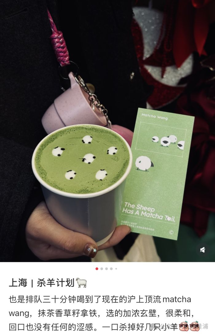 被门客们反复安利的牌号香草籽抹茶拿铁杯顶,有伙计现场手绘的可人软萌的小羊拉花,是拍照出圈的总计主角。