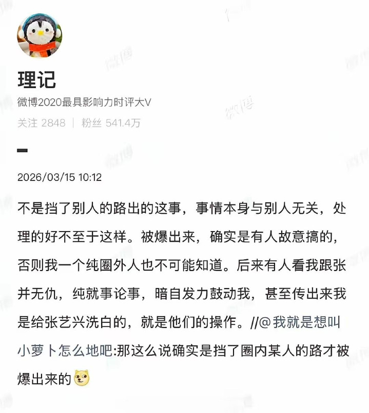 有东说念主认为是精确投阱下石,有东说念主认为是理记甩锅自卫,张艺兴这边尚未对“幕后佳偶”作出回话。