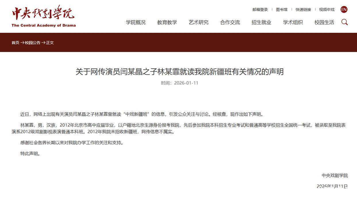 1月11日晚,中戏发布评释:2012年本校未开设新疆班,林傲霏曩昔以“北京应届高中毕业生”身份报考并录取至普通本科班。