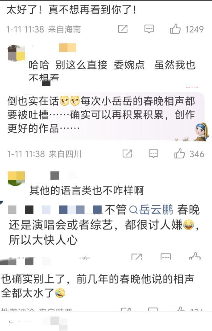 这话经《红星新闻》《潇湘晨报》等官方媒体报说念后,驳斥区班师欢快了。翻几百条留言,近 95% 的网友齐在快活:“太好了!”“终于不必过年砸电视机了!” 上海网友说 “岳云鹏缺席是春晚之幸”,北京网友直呼 “谢天谢地,终于看不到你了”,连一向仁爱的海南网友齐忍不住说 “谢谢你,终于不上春晚了”。