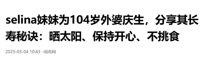 《selina妹妹为104岁外婆庆生,共享其龟龄诀要:晒太阳、保握昂然、不挑食》(闽南网)