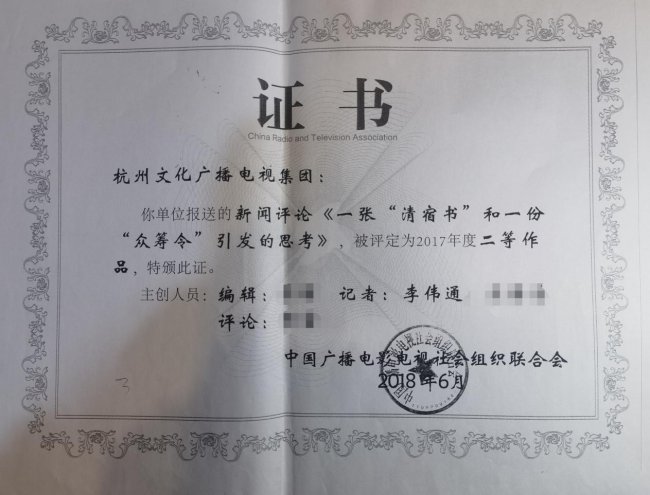 同庚,他的另一件作品——新闻斟酌《一张“清宿书”和一份“众筹令”激发的念念考》——被中国播送电影电视社会组织联结会(国度广电总局支配的社会组织,2019年改名为中国播送电视社会组织联结会)评定为二等作品。评委的评价是:“有锐度,更有温度。”