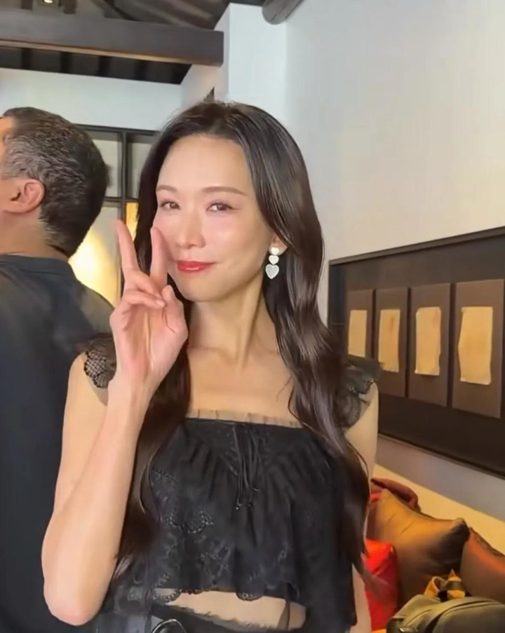 准备上场之前,林志玲在候场,傍边职责主说念主员拿入部下手机拍她,她兴盛的和镜头打呼唤。她衣着玄色的蕾丝上衣,戴着爱心耳饰,一头玄色波涛卷,对着镜头比耶,笑貌灿烂。